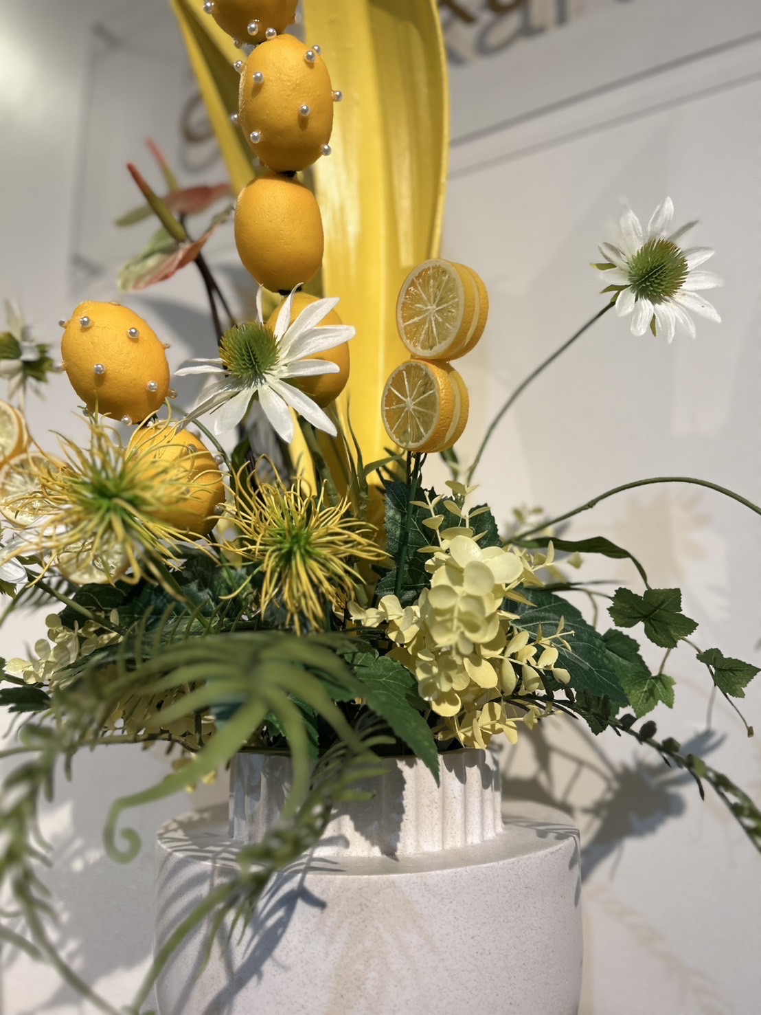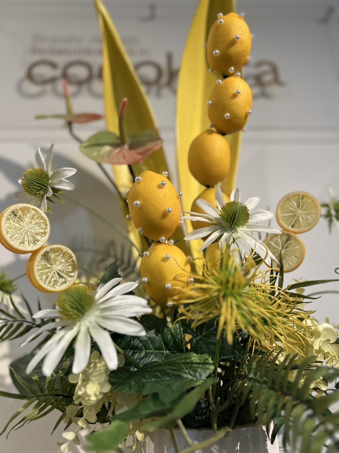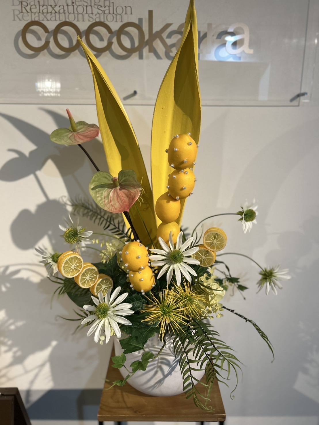 夏は県外のお客様も多いので地産のものをテーマにアレンジをしました。レモンにパールを貼り付けて串刺し!女性の好きなパールを取り入れました。