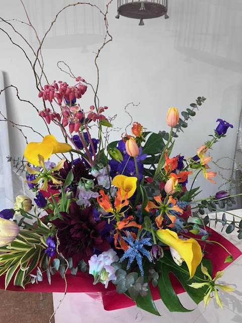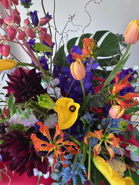 バンダ、カランコエ、ダリア、チューリップ、スイートピー、カラー、雪柳、ユーカリなど